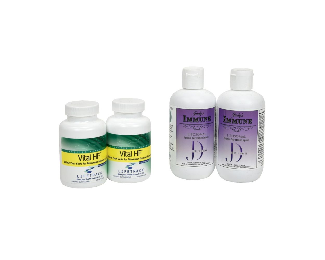 This pack contains two unique products to support the Immune System. In this pack you will receive two bottles of Vital HF™ Next Generation that supports the immune system by delivering fulvic acid, a component of humate, and is powered by Vitamin C, Echinacea, garlic, zinc and much more. This pack also contains two bottles of Judy’s Dream™ newest product, Judy’s Immune. This superior liposomal product is formulated with the essential vitamins C and D3. It contains immune-building minerals magnesium and zinc, and a potent herbal immune blend, all of which support your body’s ability to fight against the pathogens and stresses of life.